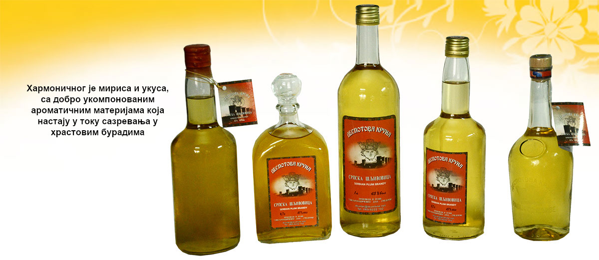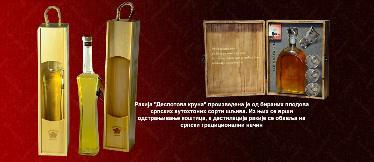 Ракија „Деспотова круна” произведена је од бираних плодова српских аутохтоних сорти шљива. Из њих се врши одстрањивање коштица, а дестилација ракије се обавља на српски традиционални начин у бакарном казану испод којег се ложи искључиво дрво. Хармоничног је мириса и укуса, са добро укомпонованим ароматичним материјама која настају у току сазревања у храстовим бурадима